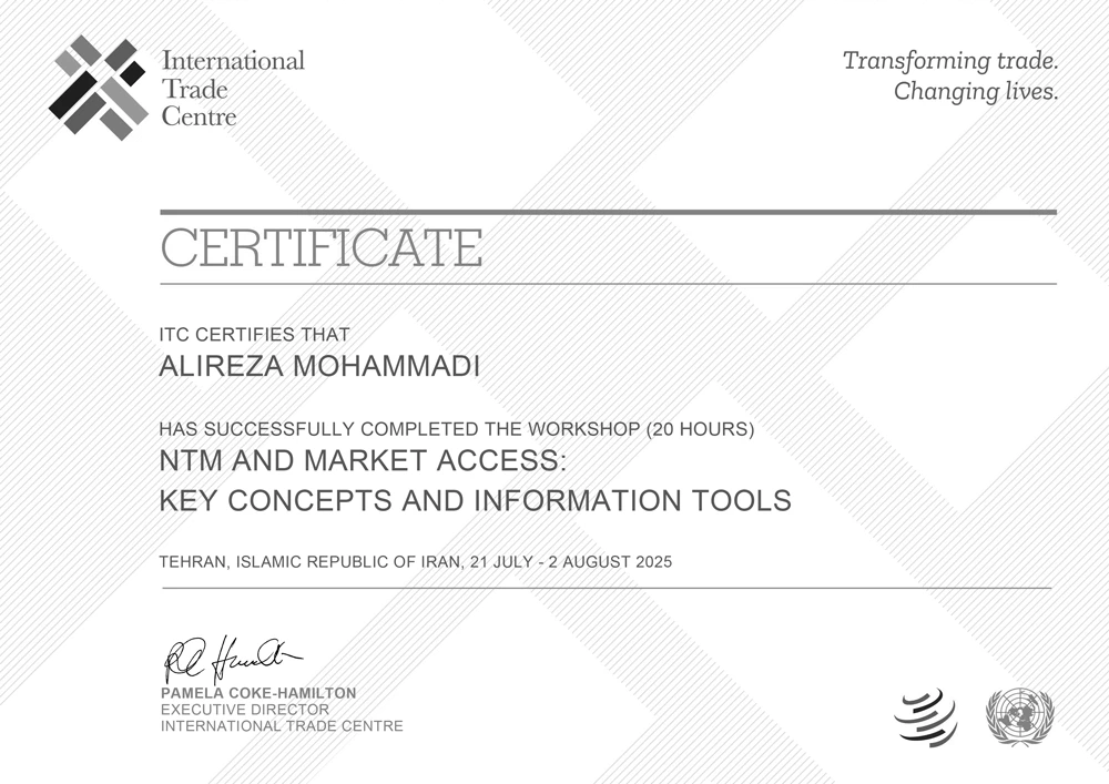 شرح دوره : کسب این مهارت، توانایی من، را در ارزیابی دقیق ریسکهای تجاری و تدوین استراتژیهای صادراتی کارآمد برای تسهیل ورود به بازارهای جهانی، به شکل مؤثری تقویت کرده است.